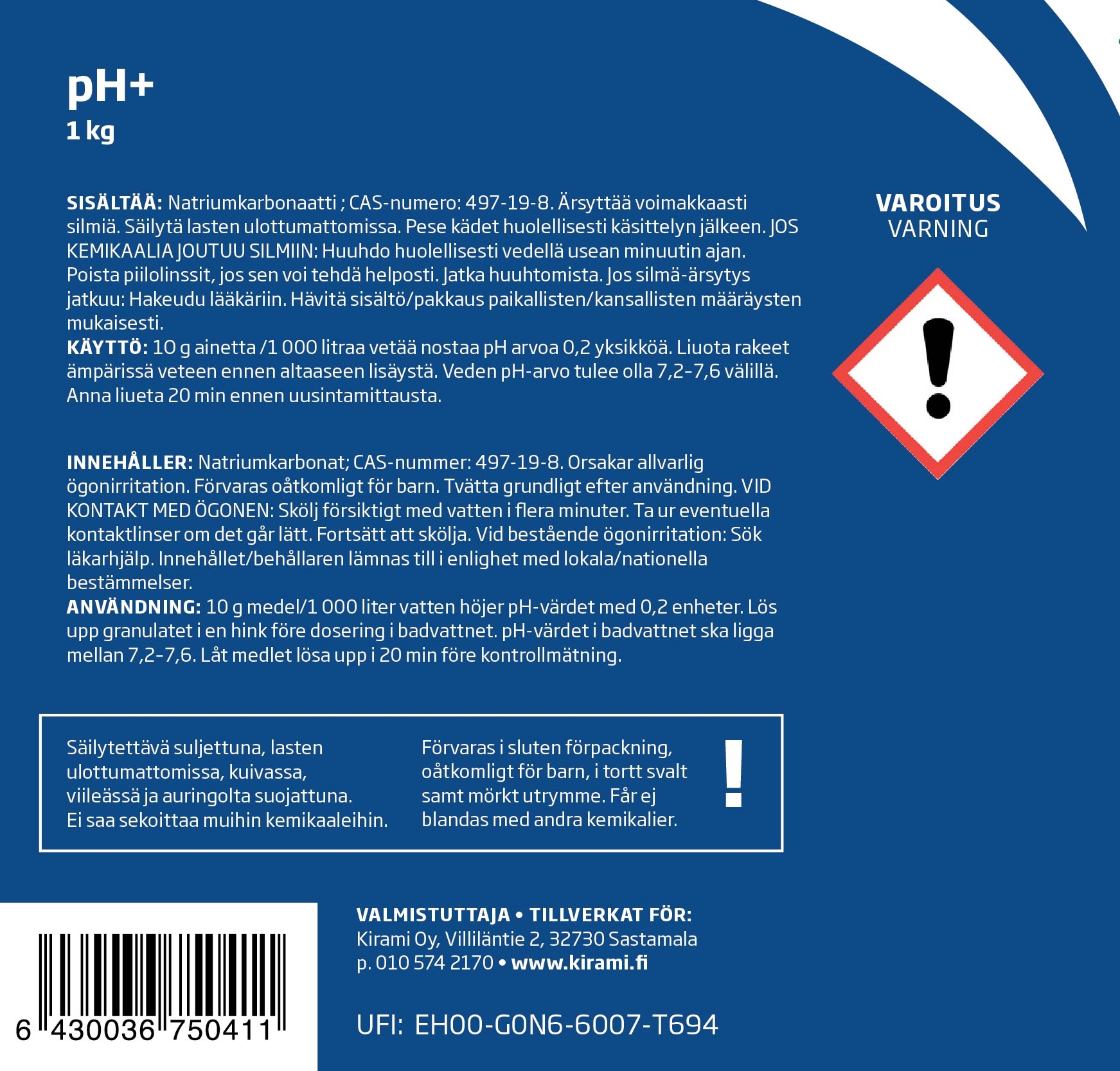 Kirami pH+ kemikaalirakeen avulla nostetaan altaan veden pH-arvoa. Liian alhainen tai liian korkea pH-arvo ärsyttää ihoa ja syövyttää altaan materiaalia. Ihanteellinen pH-arvo on 7,4 mutta arvo olisi hyvä saada pysymään rajoissa 7,2-7,6. Veden pH-arvo mitataan pooltesterillä / testiliuskoilla joita on myös saatavilla Kiramilta.