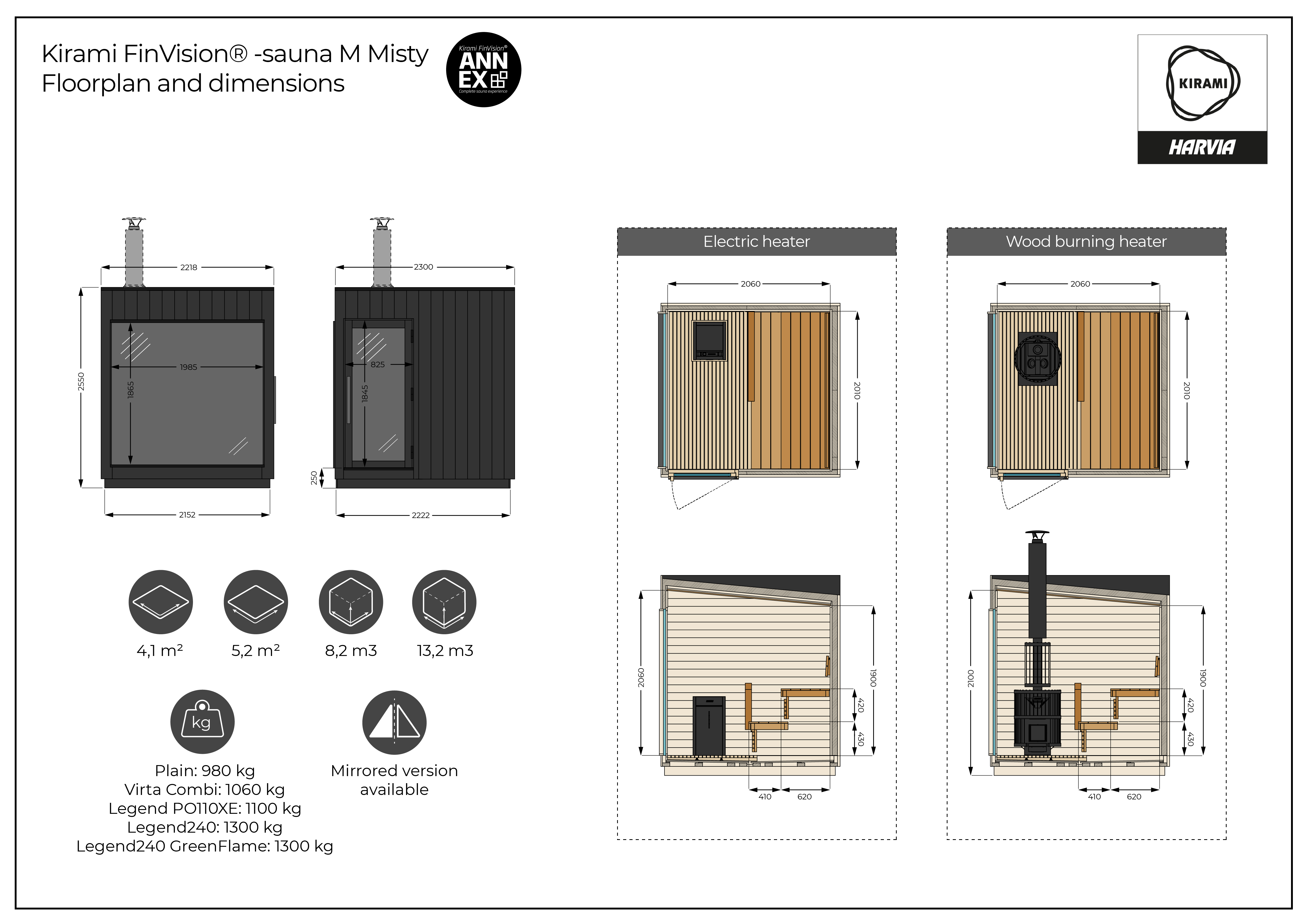 Valmiiksi pintakäsitelty Kirami FinVision® -sauna M Mistyn ulkovuoraus on lämpökäsiteltyä paneelia ja sisäpinnat lämpökäsiteltyä lehtipuuta. Saunan sisusta on moderni. Lämpökäsitellyn lehtipuun tumma väri ja tuoksu luovat lempeän ja kutsuvan tunnelman. Selkeälinjainen ja yksinkertainen tyyli sopii moneen pihaan. Isojen lasipintojen ansiosta myös luonto tulee lähelle saunojaa. Olemme varmoja, että tottumattomammastakin saunojasta kuoriutuu himosaunoja, kun pääset saunomisen tunnelmaan. Uskomme, että pihasaunasta tulee, yksi suosituimmista paikoista pihallasi.