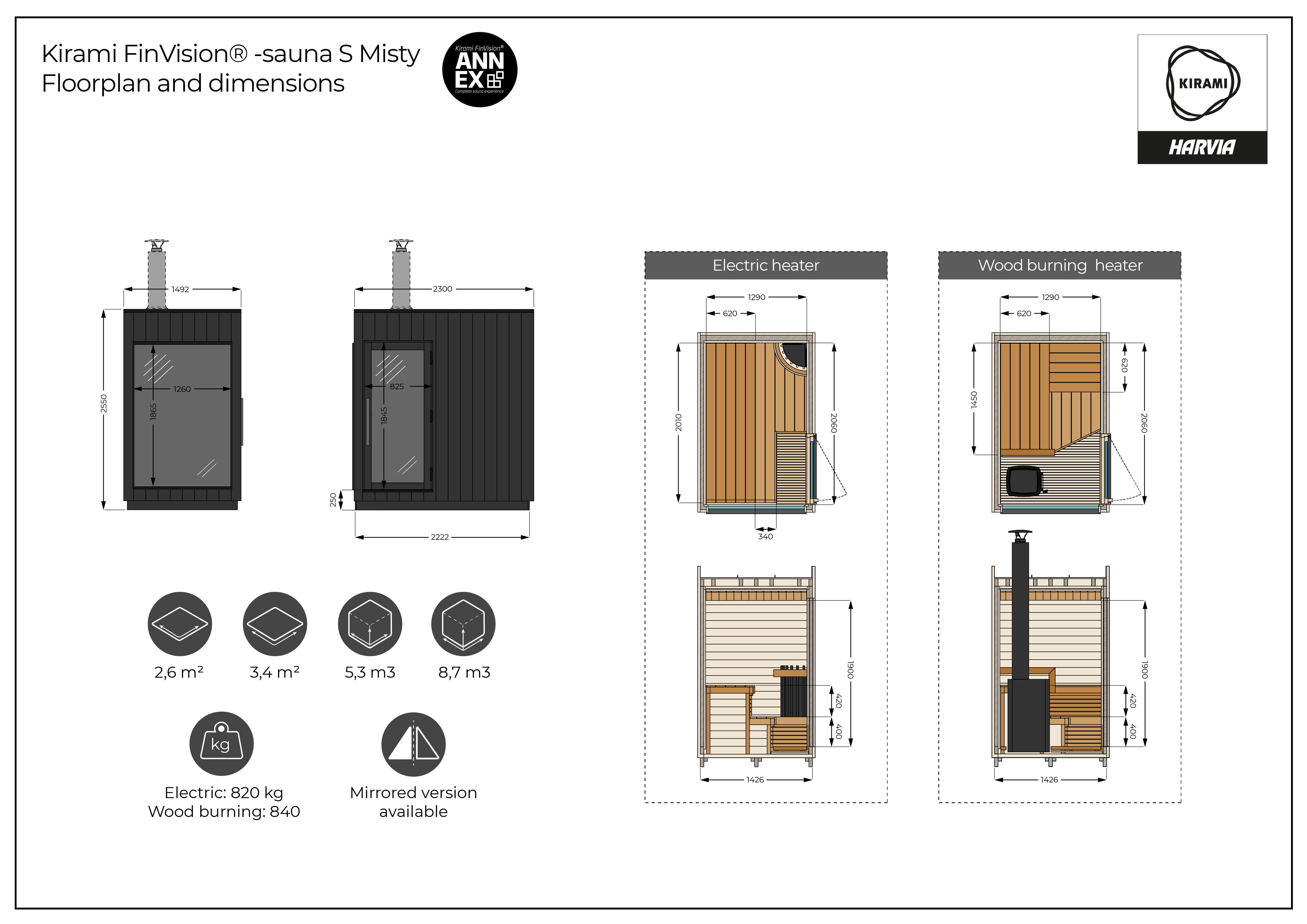 Pohjarakenteeltaan sauna on samankokoinen kuin Kirami FinVision® -pukukoppi ja muut Kirami FinVision® -terassi S . Nämä kolme Annex moduulia yhdessä luovat pienen ja näppärän kokonaisuuden pihallesi. S –kokoiseen Misty saunaan voi yhdistää myös isomman koon Misty moduuleita, sillä koosta huolimatta moduulit sopivat toisiinsa saumattomasti.